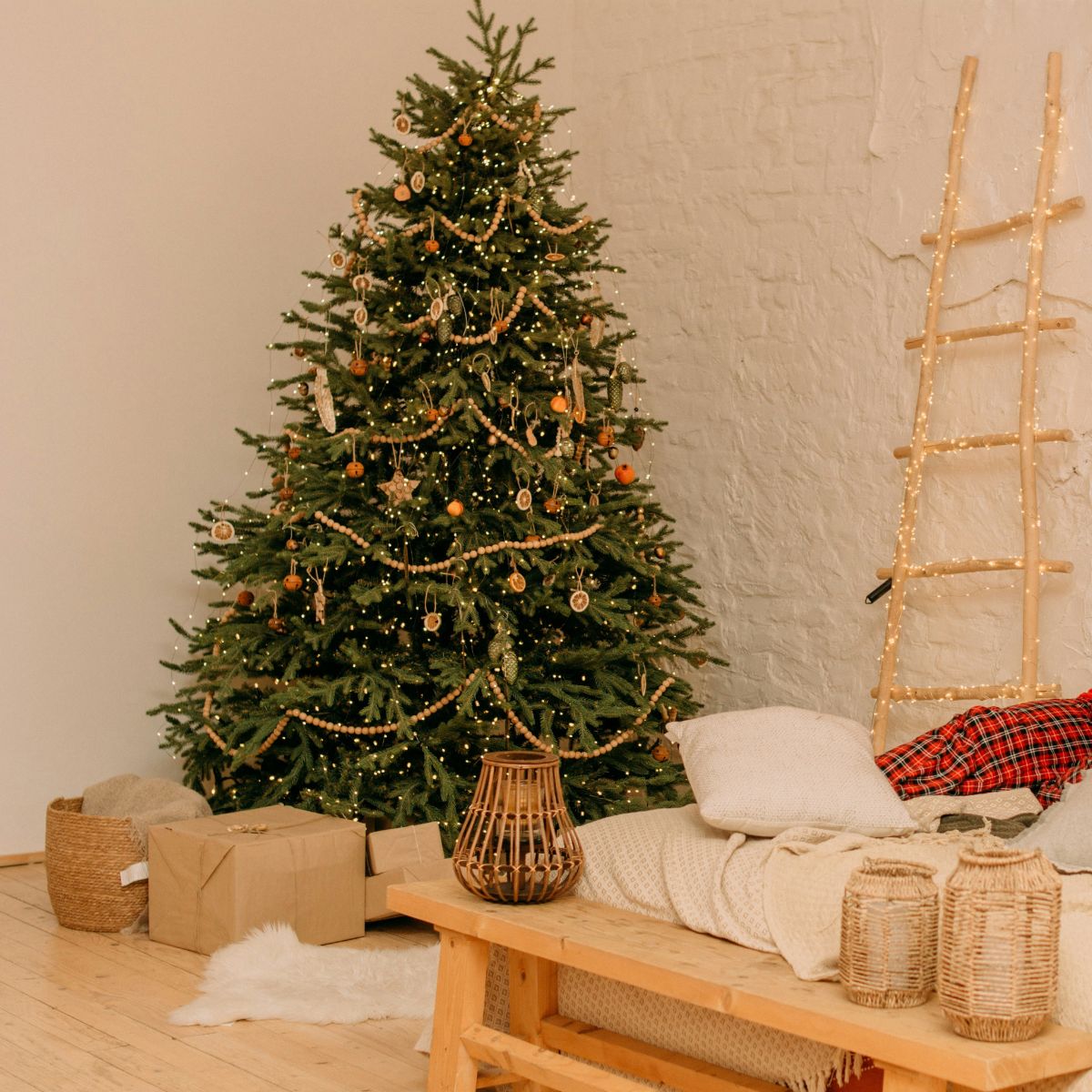 To keep the room cohesive, match the tone of your garland lighting to your tree. Use warm white for warmth, champagne for elegance, or multicoloured for a more fun theme.