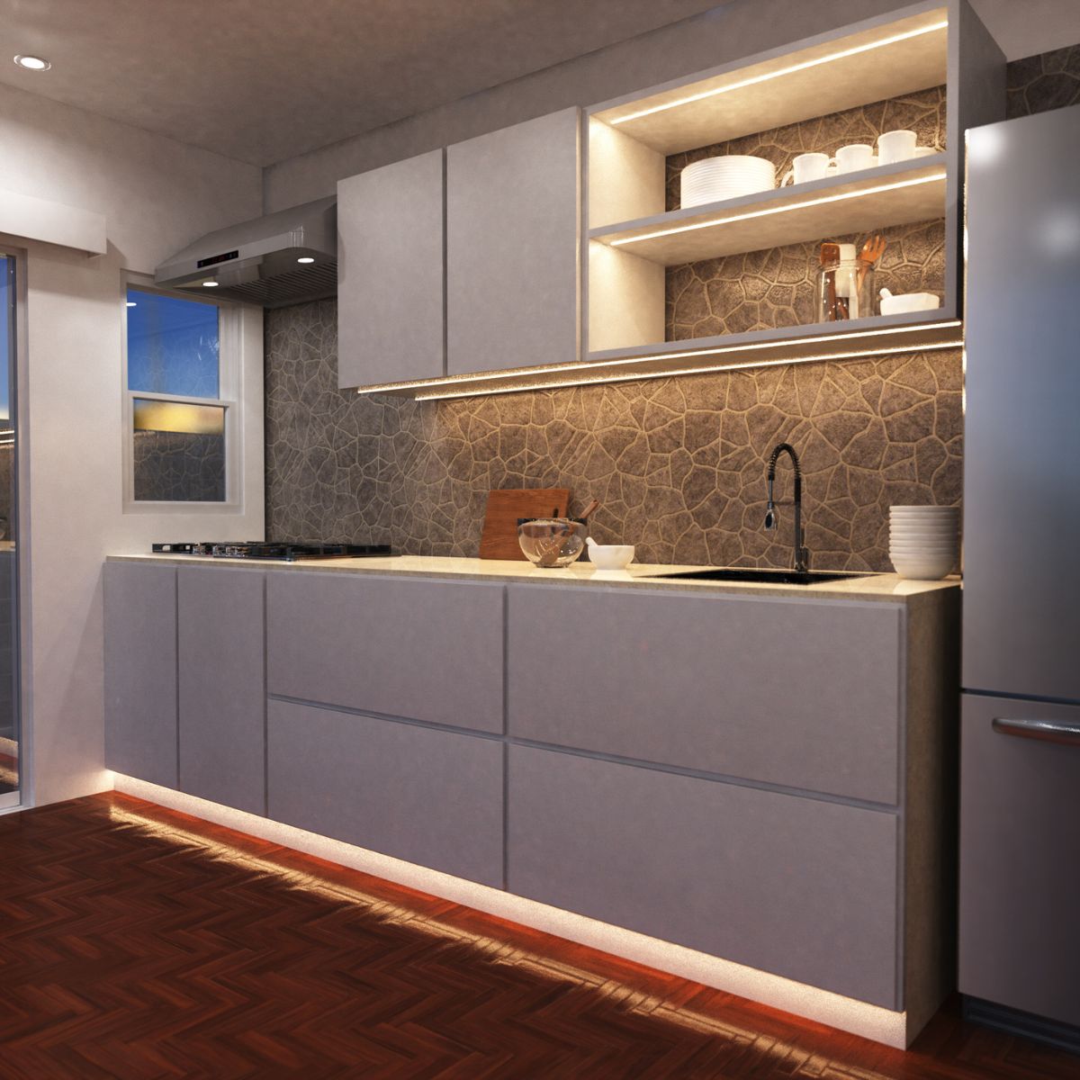 Accent Lighting: Add subtle warm white strips above cabinets or along the kickboards to highlight textures and create a floating effect.