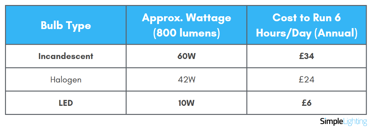 The differences might not seem like a lot for an annual cost, but this is just for one light bulb. Multiply it by 30 (the UK home’s average number of lights), and the difference will be more apparent.